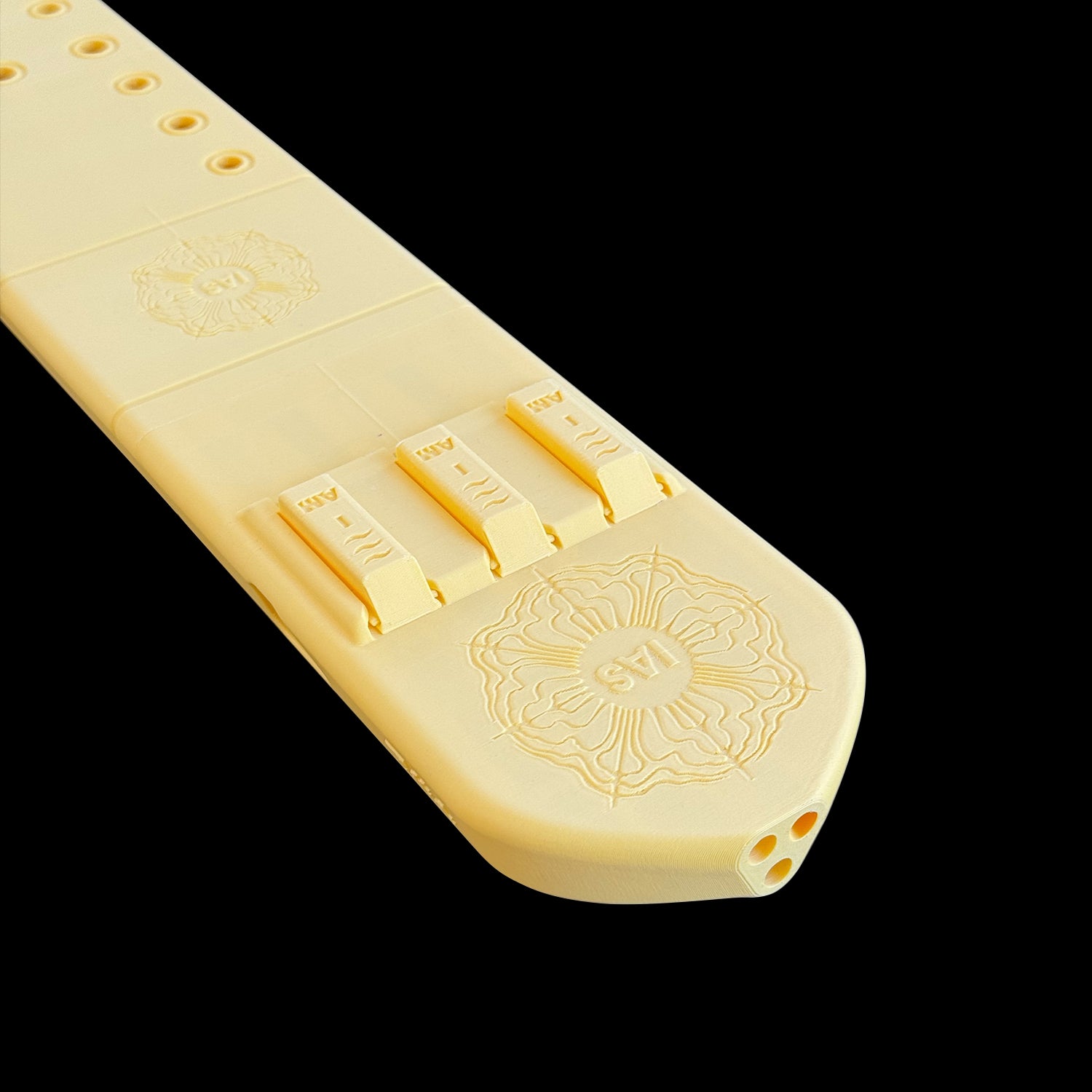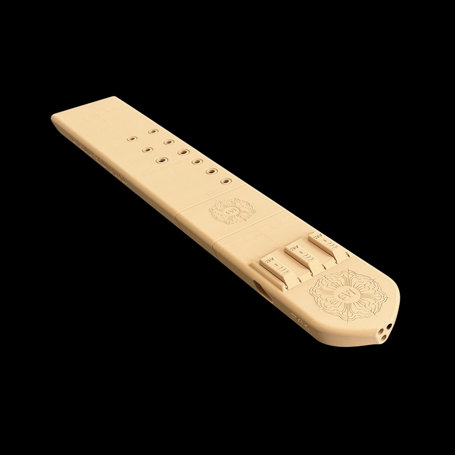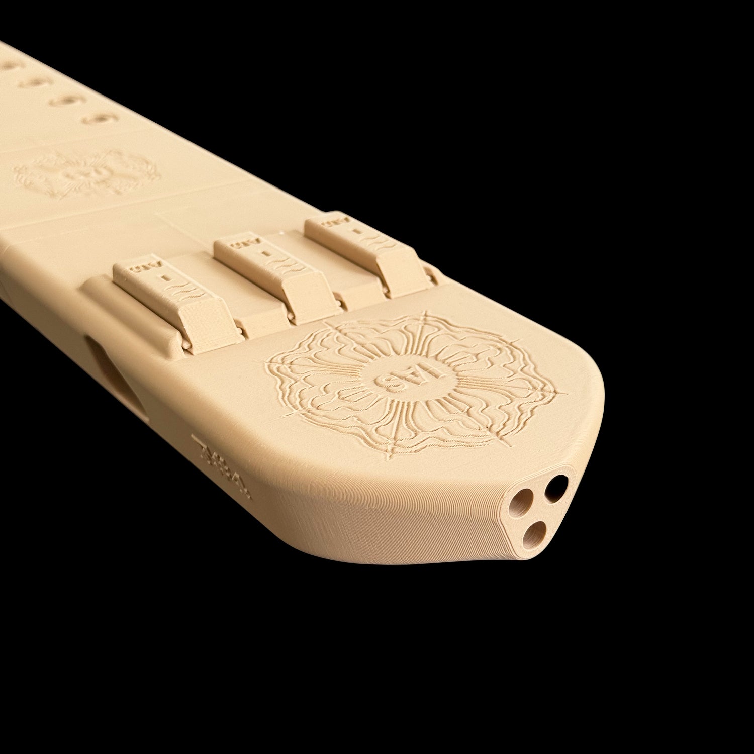 First, notice the "sound board" looking shape we went with this. This allows me to easily walk among the two playable barrels. We also widened the top surface and even customized the airway channels into a triangular configuration, allowing me to now pair the bass drone with either of the other barrels for more dynamic sounds and flexibility.